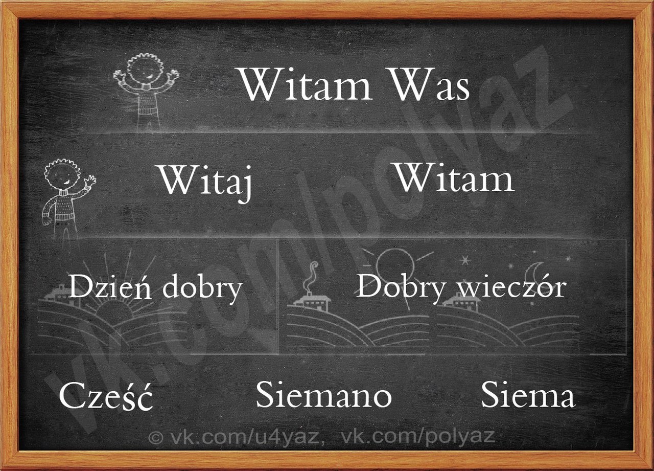 Вечером, для разнообразия, можно воспользоваться выражением ”dobry wieczór” <добры вечур>, но здесь опять же возникает вопрос, во сколько начинается этот пресловутый вечер. Четкого времени пока никто не определил, поэтому сами польские филологи советуют полагаться на интуицию. В связи с чем упомянутое выше ”dzień dobry” выигрывает вдвойне, чем и пользуются с удовольствием сами поляки. В неформальном общении с друзьями, ровесниками или близкими людьми можем смело использовать ”cześć” <чэщч> (польский аналог нашего ”привет”), „hej” <хэй> (”привет”от английского ”hey”), „siema” <щема> (аналог русского «здорово», поэтому используется чаще молодыми людьми, нежели девушками), „elo” <эл‘о> (производное от английского ”hello”, популярное среди польской молодежи).