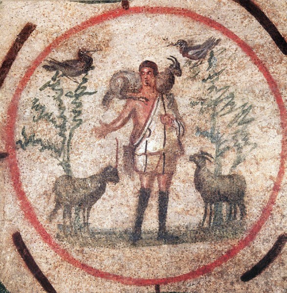 Рис. 3: Пастырь добрый, катакомбы Присциллы, 3-4 в.