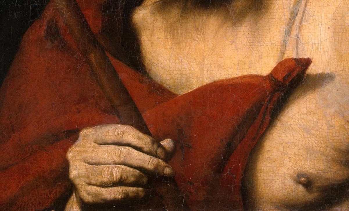 Основной задачей обоих художников является передача внутреннего состояния, характера Иисуса Христа. Но расхождение в понимании каждым автором образа Иисуса видно даже при беглом рассмотрении изображений. У Дирка Баутса он совершенно одинок: все в его выражении лица указывает на замкнутость и обращение чувств и мыслей глубоко внутрь себя. Художник не прорабатывает анатомию, скрывая тело за тканью и вырисовывая чрезмерно покатые, опущенные плечи. Это лишь обостряет эмоциональность произведения. Основой композиции является вертикаль, на которой расположены эмоциональные акценты: в первую очередь глаза; затем губы, которые находятся ровно по центру; а также руки. Именно эти элементы выражают чувства. Однако сжатые у самой рамы ладони не просто показывают его нам, но и повествуют о причине страданий Иисуса: скоро гвозди пройдут сквозь его плоть, вонзятся в кисти, а копье пробьет сердце (рис. 10). В одной точке сосредоточены места трех будущих ран Христа. Эта точка является символическим центром композиции. Наклон головы сопровождает направление взгляда: из-под полуприкрытых век смотрит Иисус почти потухшим, слабо бликующим взглядом по диагонали вниз. Ничто в его образе не выходит вовне, чувства скрыты глубоко внутри. Мы видим проявление духовной стойкости, скрытой силы Иисуса. Страдание его тихо, кротко, и только кровь и покрасневшие глаза, сочащиеся слезами, показывают, как тяжело дается это смирение Спасителю рода человеческого.