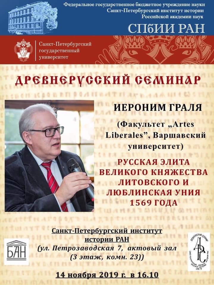 🎓В рамках заседания состоится доклад Иеронима Грали (профессор Варшавского университета, факультет „Artes Liberales”) на тему “Русская элита Великого княжества Литовского и Люблинская уния 1569 года”.