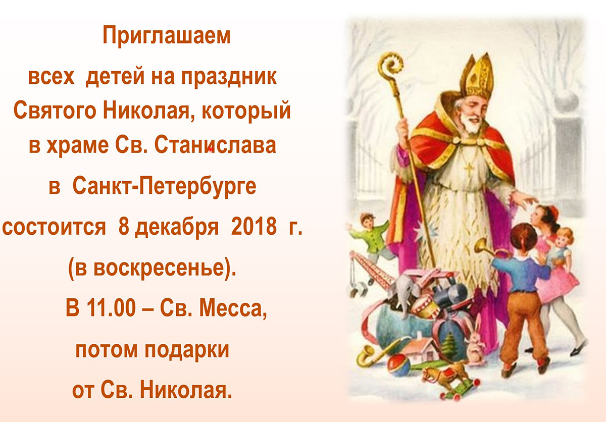 ПРИГЛАШАЕМ ВСЕХ ДЕТЕЙ НА ПРАЗДНИК СВЯТОГО НИКОЛАЯ, КОТОРЫЙ В ХРАМЕ СВ. СТАНИСЛАВА В САНКТ-ПЕТЕРБУРГЕ СОСТОИТСЯ 8 ДЕКАБРЯ (В ВОСКРЕСЕНЬЕ). В 11.00 – СВ. МЕССА, ПОТОМ ПОДАРКИ ОТ СВ. НИКОЛАЯ.