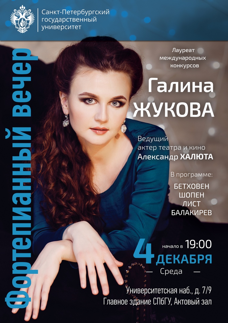 4 декабря в Актовом зале Здания Двенадцати коллегий пройдёт фортепианный вечер лауреата международных конкурсов, доцента СПбГУ Галины Жуковой.
