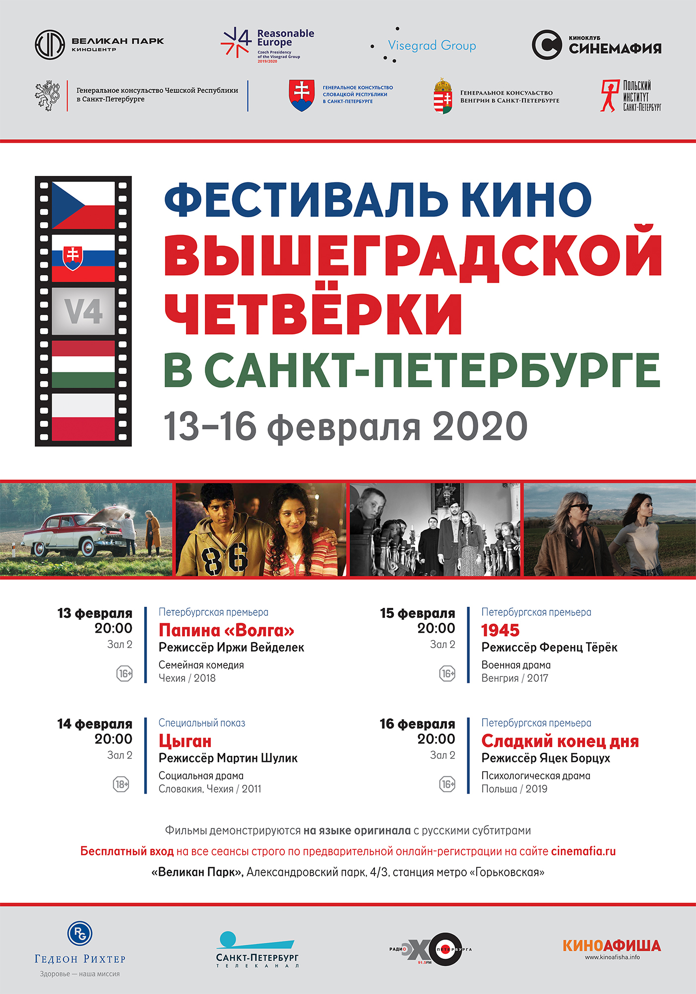 Instytut Polski w Sankt Petersburgu zaprasza na 5. Festiwal Filmowy Grupy Wyszehradzkiej, który odbędzie się w dniach 13–16 lutego w kinie Wielikan Park (park Aleksandrowskiego, 4/3). Program festiwalu w załączeniu.