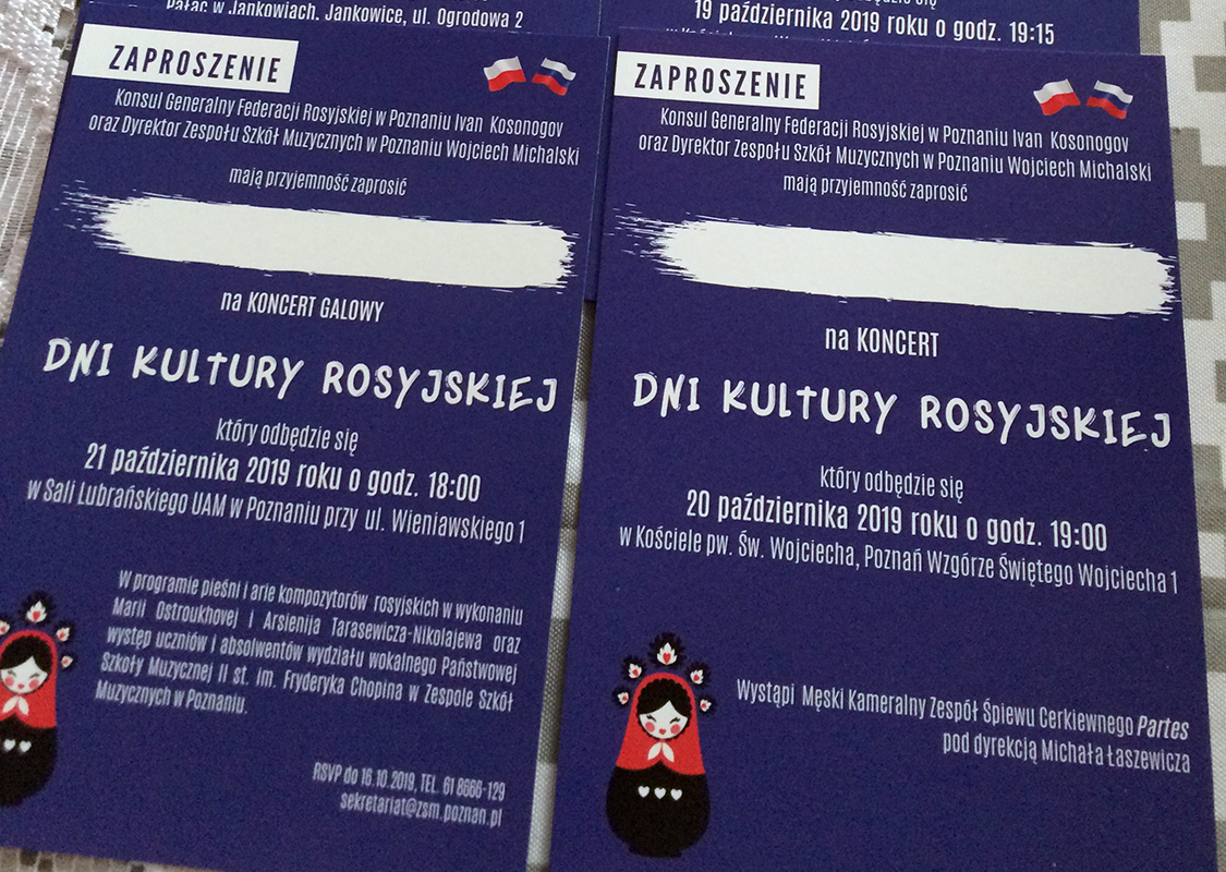 (Dni Kultury Rosyjskiej w Poznaniu organizowane przez Zespół Szkół Muzycznych w Poznaniu od 18 do 25 października 2019 roku to siedem koncertów, w tym cztery z udziałem znakomitych moskiewskich artystów młodego pokolenia: śpiewaczki Marii Ostroukhovej i pianisty Arsienija Tarasewicza-Nikolajewa. Inne wydarzenia Dni, to dwa koncerty muzyki cerkiewnej w poznańskich kościołach, występy uczniów i absolwentów Zespołu, mistrzowski kurs pianistyczny, seminarium popularno – naukowe, warsztaty językowe, wystawy. Dni Kultury Rosyjskiej są odpowiedzią na Festiwal „Młodzieżowa Akademia Sztuk” w Moskwie.