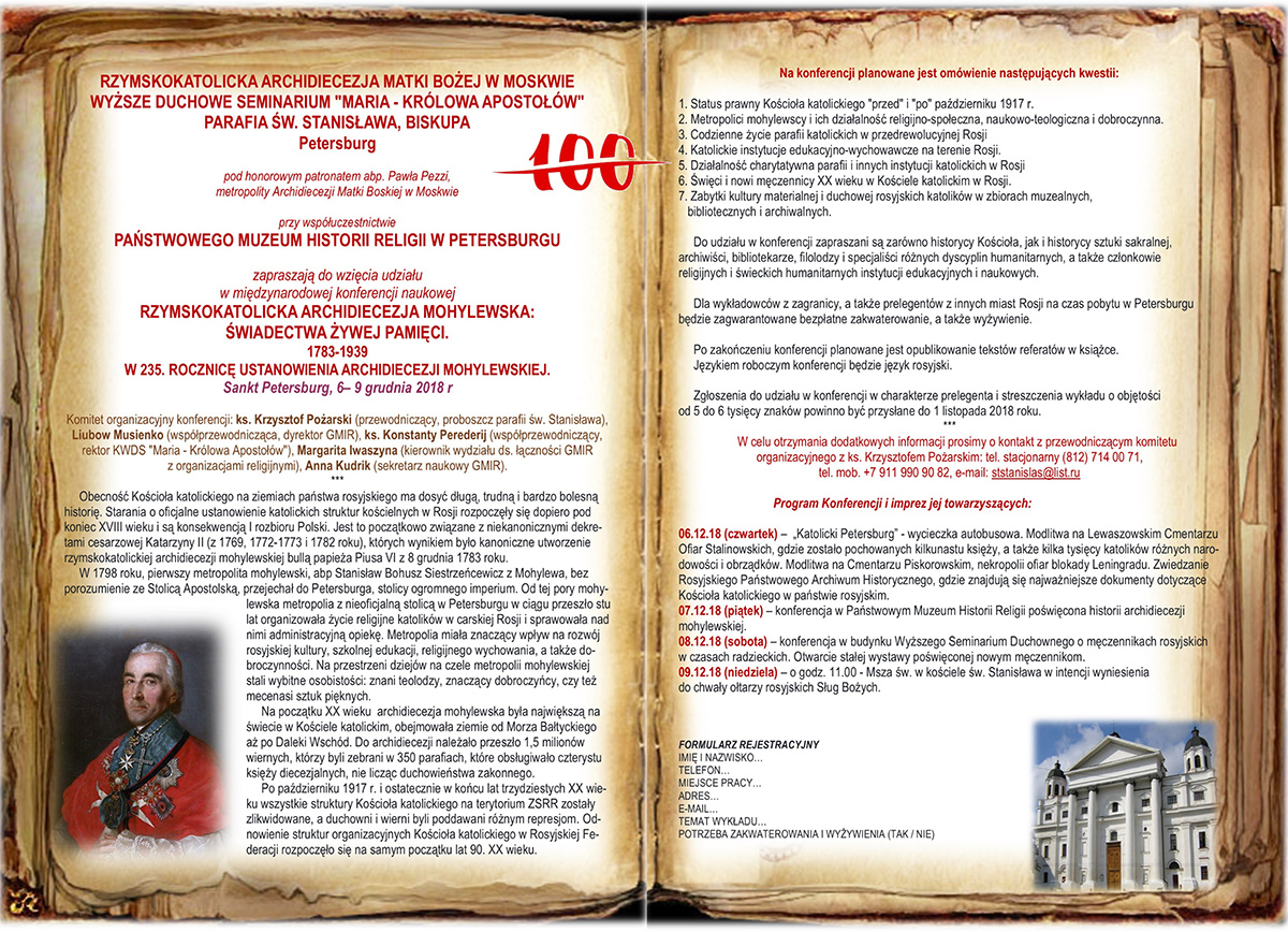 06.12.18 (czwartek) – „Katolicki Petersburg” – wycieczka autobusowa. Modlitwa na Lewaszowskim Cmentarzu Ofiar Stalinowskich, gdzie zostało pochowanych kilkunastu księży, a także kilka tysięcy katolików różnych narodowości i obrządków. Modlitwa na Cmentarzu Piskorowskim, nekropolii ofiar blokady Leningradu. Zwiedzanie Rosyjskiego Państwowego Archiwum Historycznego, gdzie znajdują się najważniejsze dokumenty dotyczące Kościoła katolickiego w państwie rosyjskim.