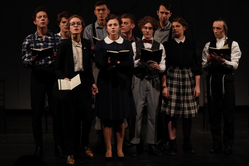 Zdjęcie w tle: Spektakl „Nasza klasa. Historia w lekcjach” wystawionych przez Teatr Studencki Rosyjskiego Państwowego Instytutu Sztuk Scenicznych, kurs profesora W. Felsztyńskiego, reż. D. Szamina.