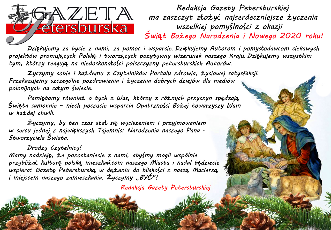 Redakcja Gazety Petersburskiej życzy swoim czytelnikom i przyjaciołom zdrowych, radosnych świąt Bożego Narodzenia w gronie rodziny i najbliższych osób. Pamiętamy również o tych z Was, którzy z różnych przyczyn spędzają święta samotnie – niech poczucie Bożej opatrzności towarzyszy Wam w każdej chwili. Niech ten czas stanie się okazją nie tylko do hucznego świętowania, ale również do wyciszenia się i przyjmowania w sercu jednej z największych Tajemnic: narodzenia naszego Pana, Stworzyciela świata.