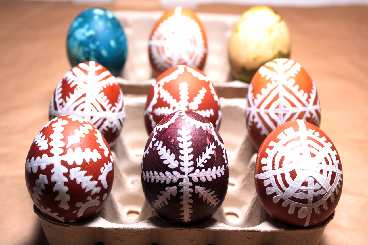 Kolorystyka tego regionu wyróżnia się szczególną grafiką i powściągliwością kolorów. Często, aby nałożyć delikatny geometryczny wzór na jajko, zastosowano specjalne urządzenie wykonane z drewnianej rączki i blaszanego lejka, do którego wlewano stopiony wosk. Zaczynano od wosku, a następnie jajko malowano, po czym następnie wosk usuwano. Pod nim otwierał się wzór białych linii.